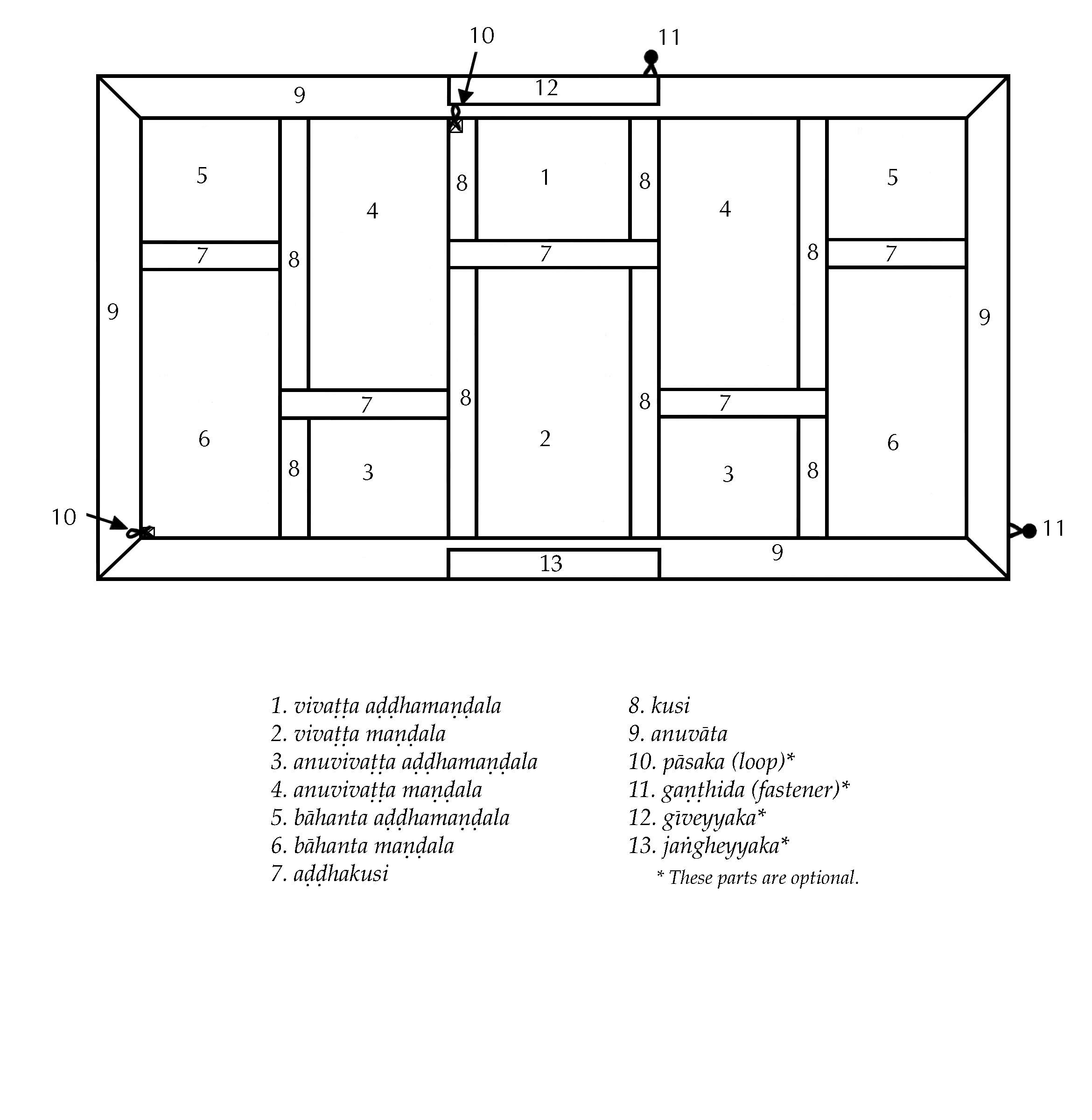 Each cut robe made to the standard pattern has at least five sections, called khaṇḍas. Although more than five khaṇḍas are allowed, only odd numbers should be used, and not even. The Canon lists names for the parts of the cut robe without explanation. The Commentary interprets them as follows: Each khaṇḍa is composed of a larger piece of cloth, called a maṇḍala (field-plot), and a smaller piece, called an aḍḍhamaṇḍala (half-plot), separated by a small strip, like the dike in a rice field, called an aḍḍhakusi (half-dike). Between each khaṇḍa is a long strip, again like the dike in a rice field, called a kusi (dike). None of the texts mention this point, but it is customary that if the maṇḍala is in the upper part of its khaṇḍa, the maṇḍalas in the neighboring khaṇḍas will be in the lower part of theirs, and vice versa. The central khaṇḍa is called the vivaṭṭa (turning-back); the two khaṇḍas on either side of it, the anuvivaṭṭas; and the remaining khaṇḍas, bāhantas (armpieces), as they wrap around the arms. An alternative interpretation, which the Commentary attributes to the Mahā Aṭṭhakathā, is that all khaṇḍas between the vivaṭṭa and the outermost khaṇḍas are called anuvivaṭṭas, while only the outermost khaṇḍas are called bāhantas. The entire robe is surrounded by a border, called an anuvāta.