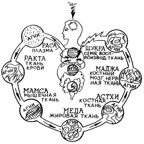Третий элемент - огонь. Источником огня и света в солнечной системе является солнце. В теле человека источник огня - это обмен веществ, метаболизм. Огонь действует в системе пищеварения. Огонь проявляется как интеллект в сером веществе клеток мозга. Огонь проявляется также в сетчатке глаза, воспринимающей свет. Таким образом, температура тела, процесс пищеварения, мышление и способность видеть - все это функции огня. Весь метаболизм и ферментная система контролируются этим элементом.