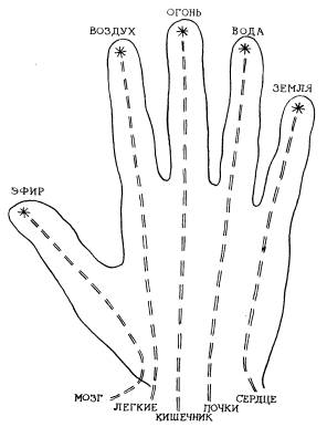 Воздух связан с чувством осязания; органом осязания является кожа. Органом, передающим чувство осязания, является рука. Кожа на руке очень чувствительна, рука наделена способностью держать, давать и принимать.
